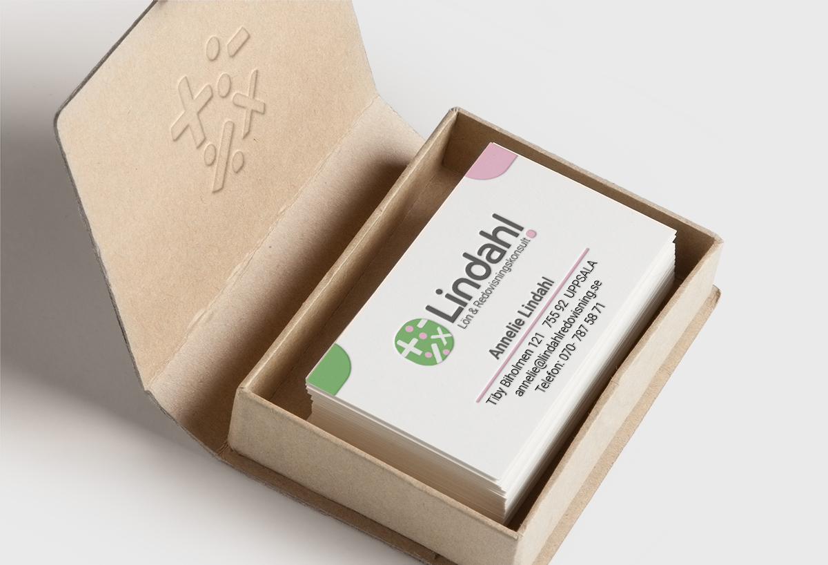 Fasonera har tagit fram logotyp och design av visitkort till företaget. Formspråket är modernt, ljust och lekfullt. I logotypen används symboler som för tanken till ekonomi, matematik och plusresultat. Dessa traditionella symboler används på ett lekfullt sätt med spännande färgnyanser.