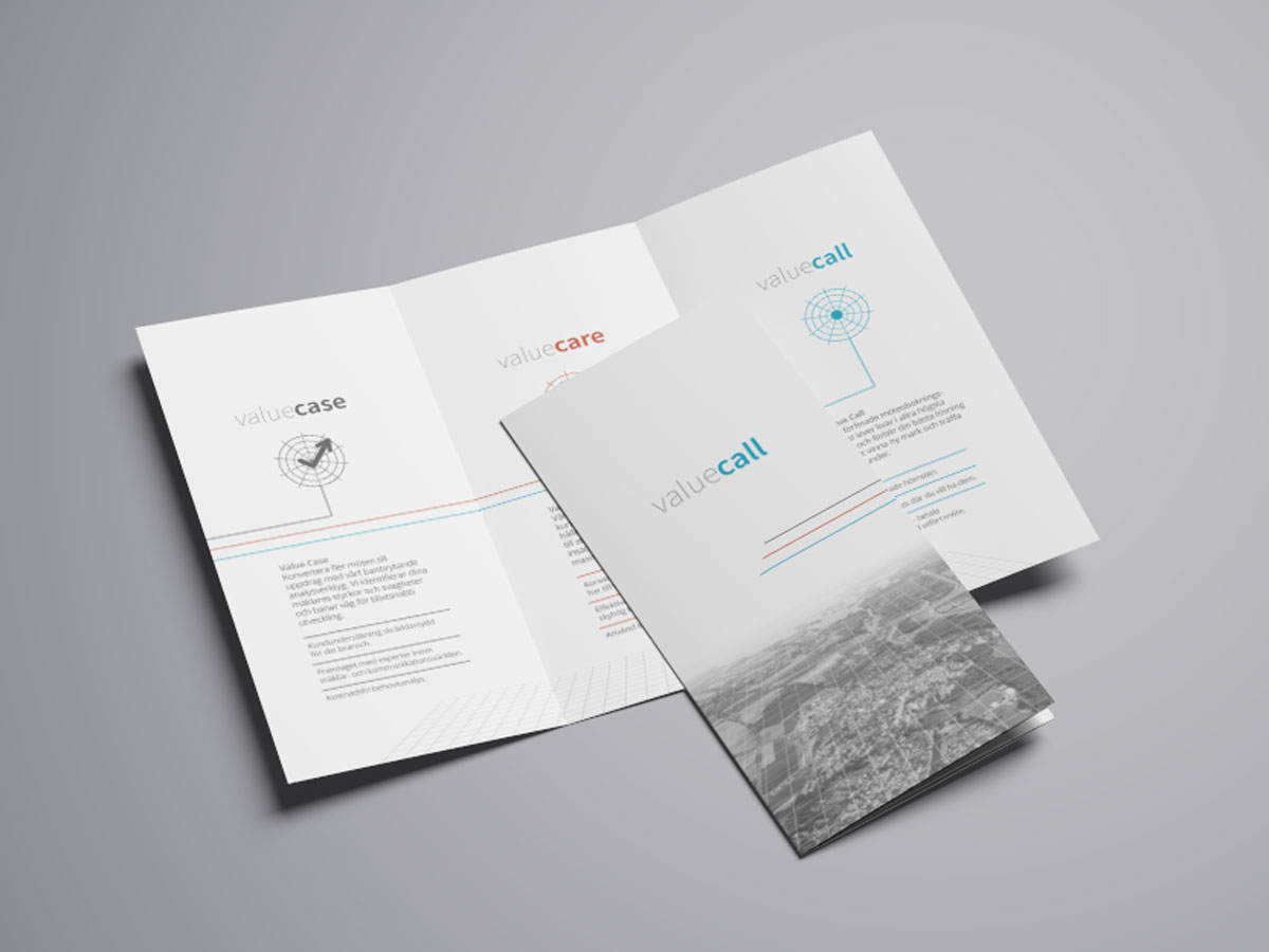 Designen bygger på det makroperspektiv som Value Call kan hjälpa sina kunder att inta. Symbolerna för tanken till en radarskärm eller måltavla. Bilder och illustrationer visar på överblick och träffsäkerhet. Stilen är modern och självsäker.